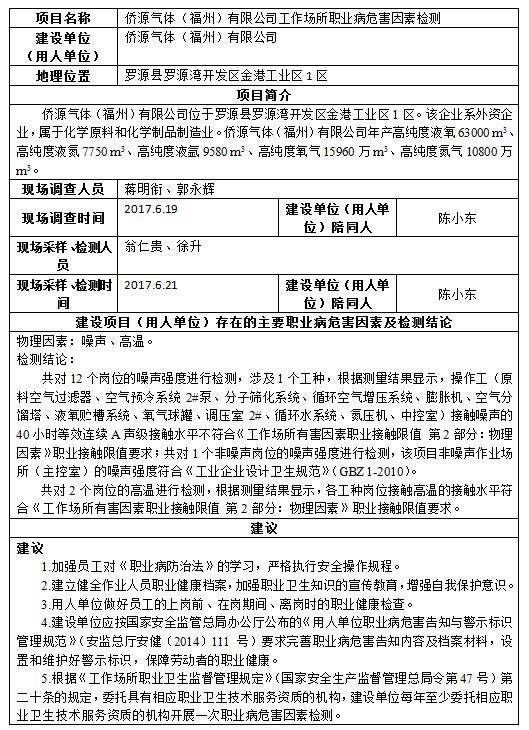 僑源氣體(福州)有限公司工作場所職業病危害因素檢測-福建共益安全環保科技